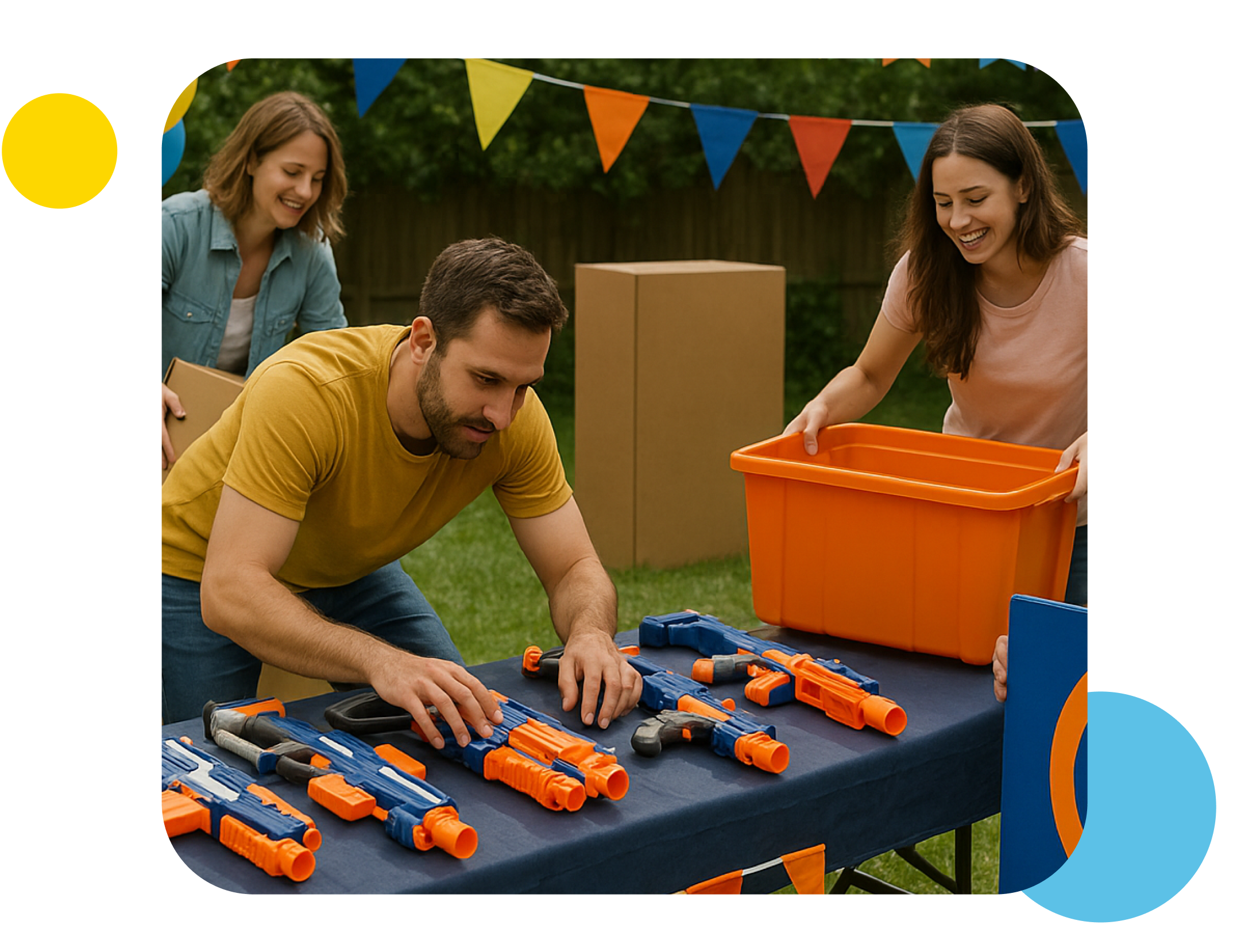 Action-packed games: Slip n slide, water balloon toss, bucket relays, water tag battle, and more.